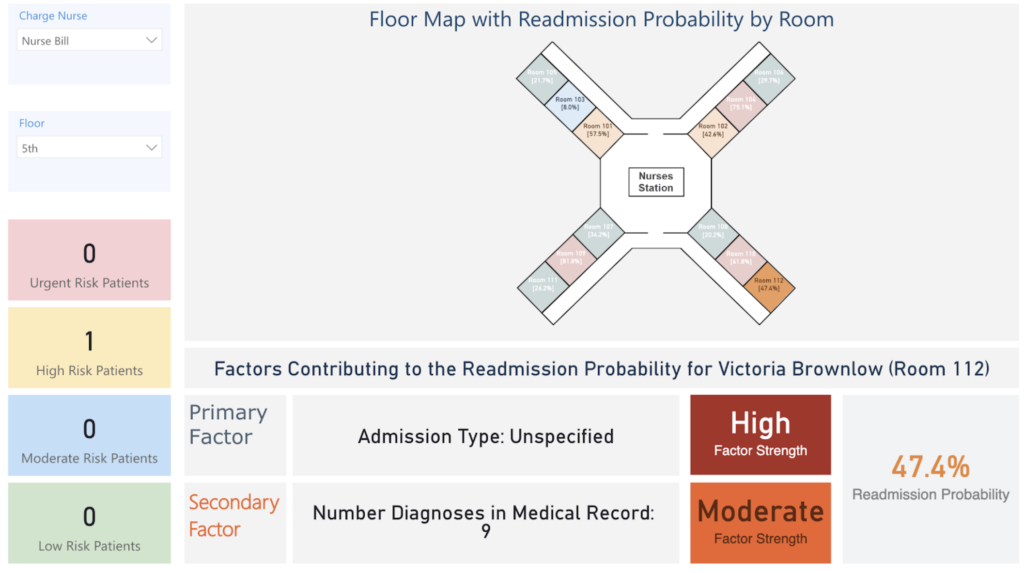 The dashboard below displays the probability of readmission for each patient on the floor. It shows the patient’s likelihood to readmit and top factors on why the model made the prediction. Nurses and physicians can consume a dashboard similar to this one to understand which patients are likely to readmit and why, allowing them to implement a prevention strategy tailored to each patient’s unique needs.