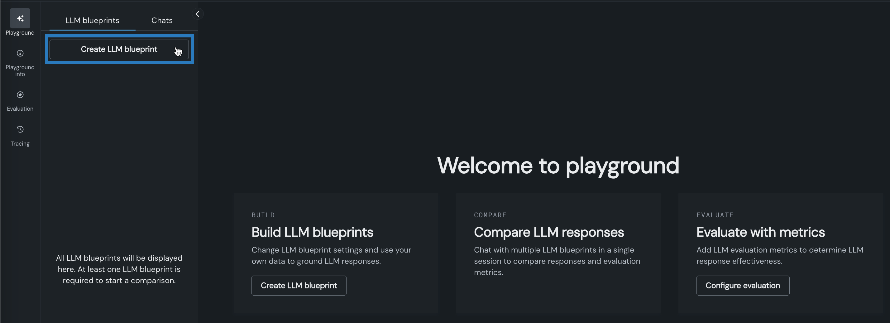 In the Playground, on the LLM blueprints panel, click Create LLM blueprint: