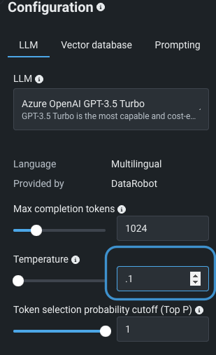 Field Setting Notes LLM Azure OpenAI GPT-3.5 TurboAlternatively, you can add a deployed LLM to the playground, which, when validated, is added to the Use Case and available to all associated playgrounds. Max completion tokens 1024(default)The maximum number of tokens allowed in the completion. Temperature .1Controls the randomness of model output. Change this to focus on truthfulness for scientific research papers. Top P 1(default)Sets a threshold that controls the selection of words included in the response based on a cumulative probability cutoff for token selection