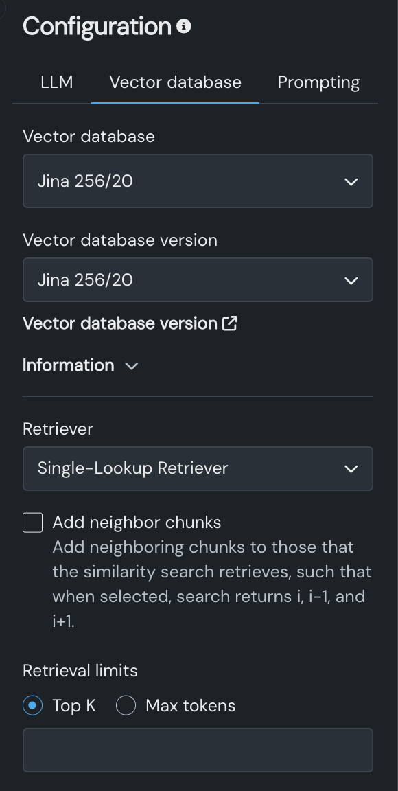 intfloat/e5-base-v2as the embedding model. To compare it against theJinamodel, make the Chunk overlap and Max tokens per chunk settings the same as those you set in step 2. That is, chunk overlap of 20% and max tokens of 256.