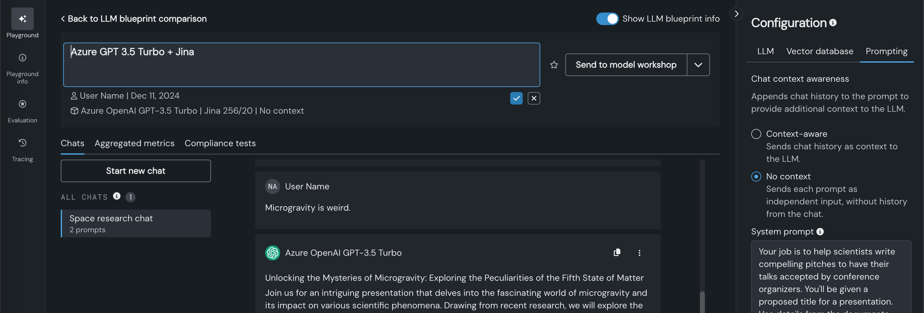 The playground is where you create and compare LLM blueprints, configure metrics, and compare LLM blueprint responses before deployment. Create a playground using one of two methods.