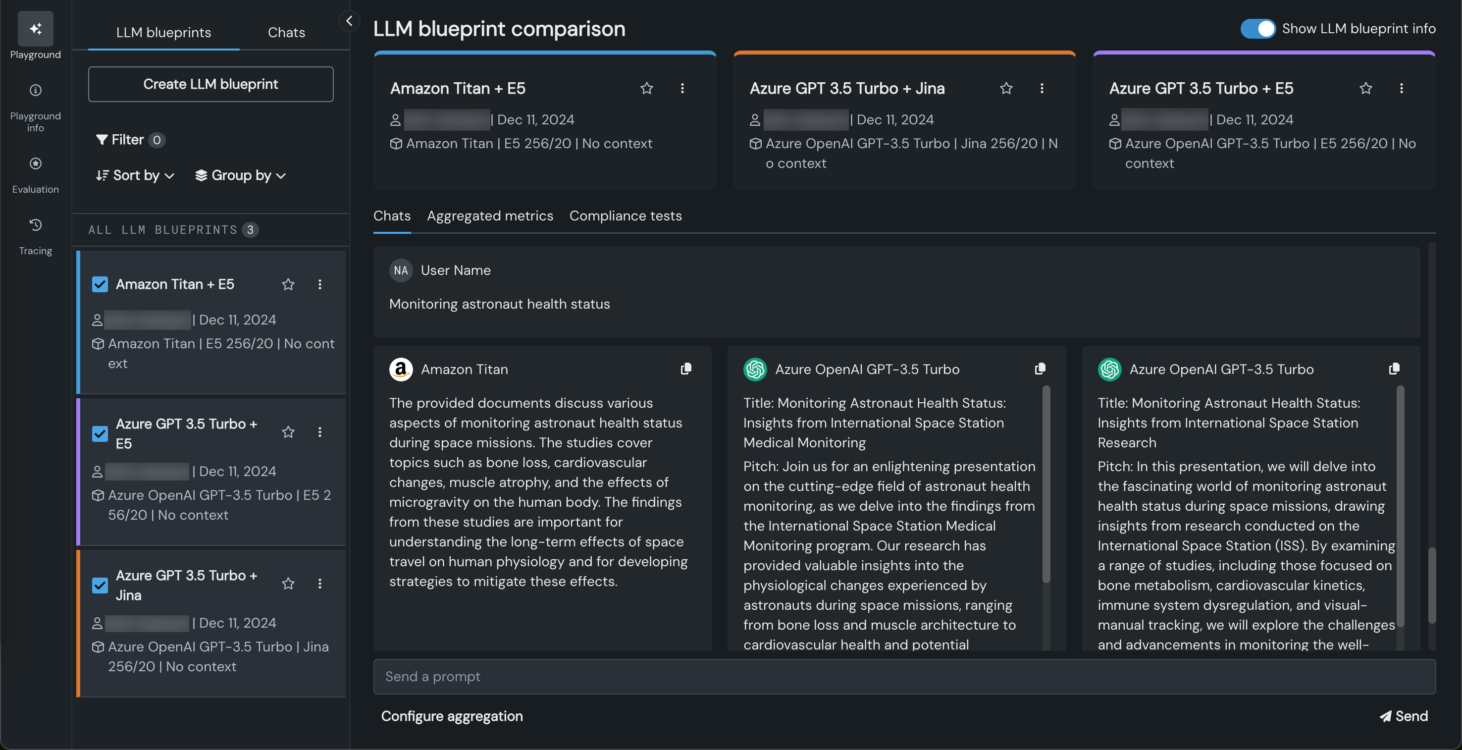 To start the comparison, select all three blueprints by checking the box to the left of the name. Notice that a summary is available for each. Enter a new topic for exploration in the Send a prompt field. For example: Monitoring astronaut health status.