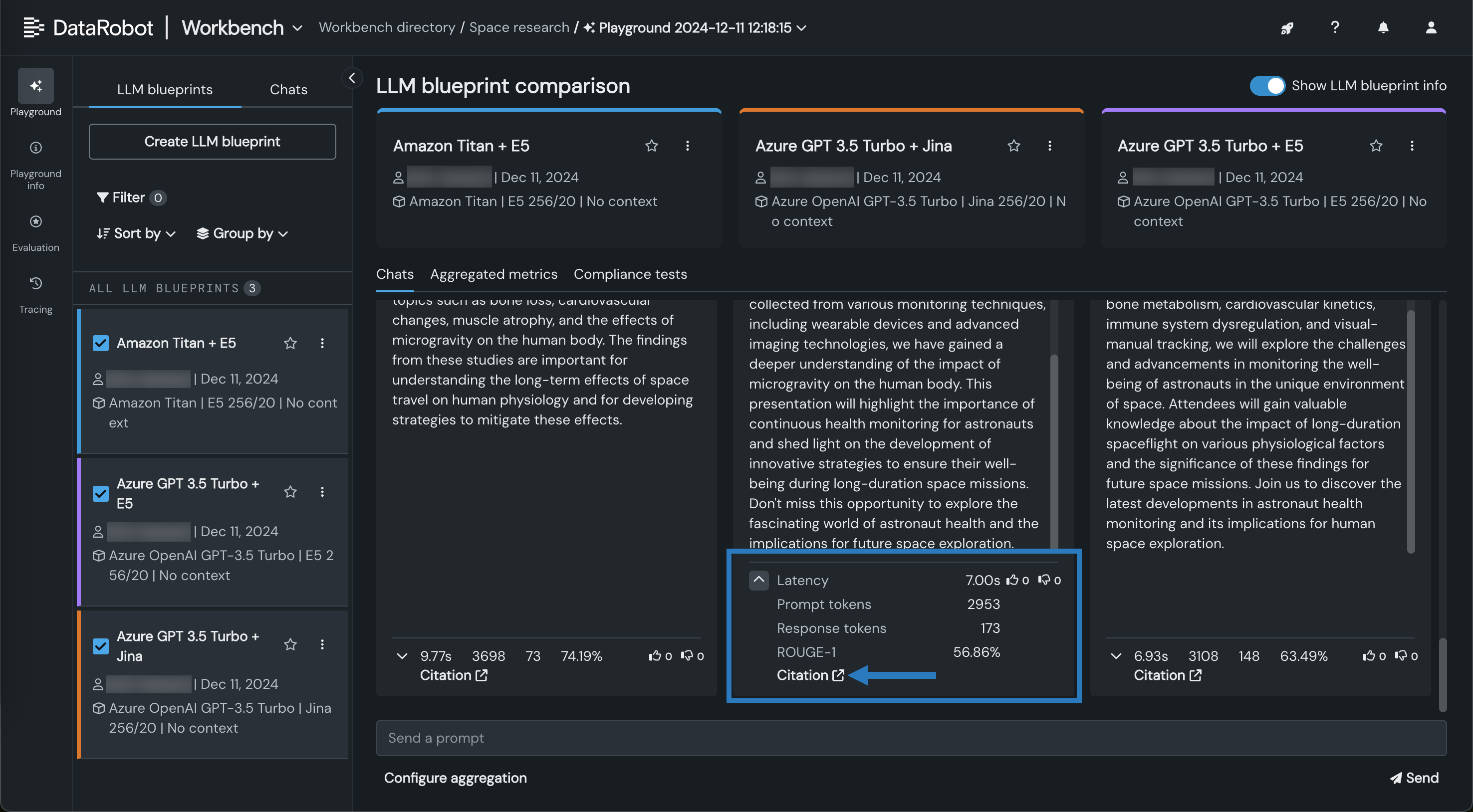 One method of evaluating a response is to look at the basic information DataRobot returns with each prompt, summarized below the response. Expand the information panel for the LLM blueprint that used the Jina vector database; you can see that the response took seven seconds, had 173 response tokens, and scored 56.86% on the ROUGE-1 confidence metric. The ROUGE-1 metric represents how similar this LLM answer is to the citations provided to aid in its generation.