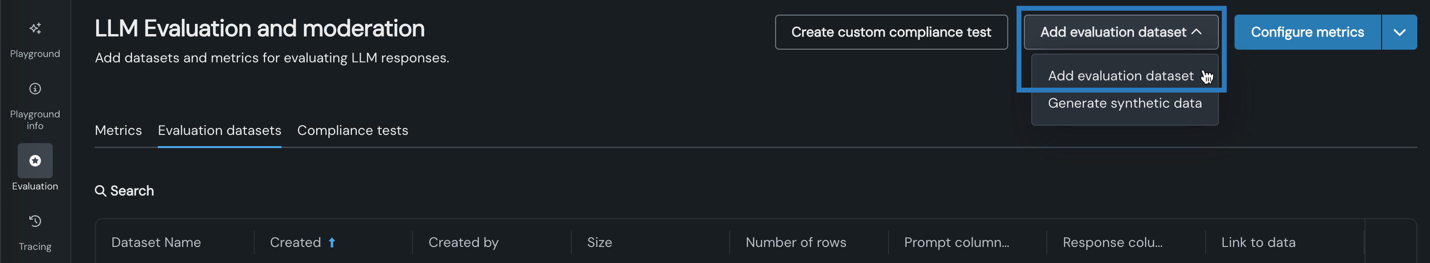 From the LLM evaluation page, click the Evaluation datasets tab and then Add evaluation dataset.