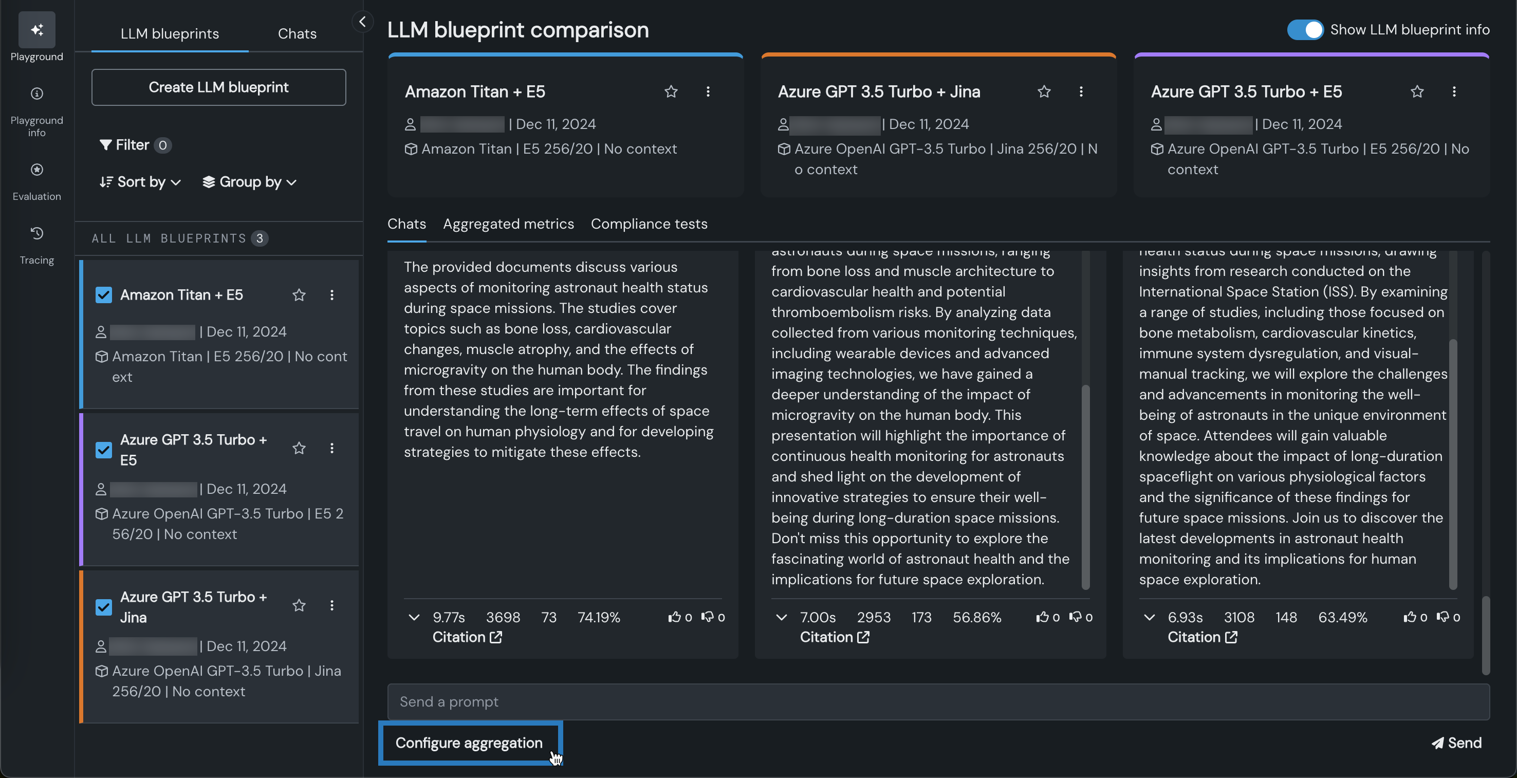 to return to the LLM blueprint comparison, then, in the bottom left under the responses, click Configure aggregation.