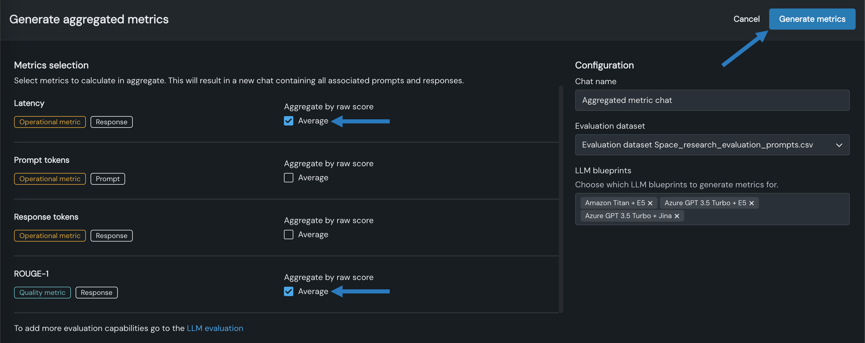 The Generate aggregated metrics page opens. Set the Latency and ROUGE-1 metrics to Average. Then, click Generate metrics.