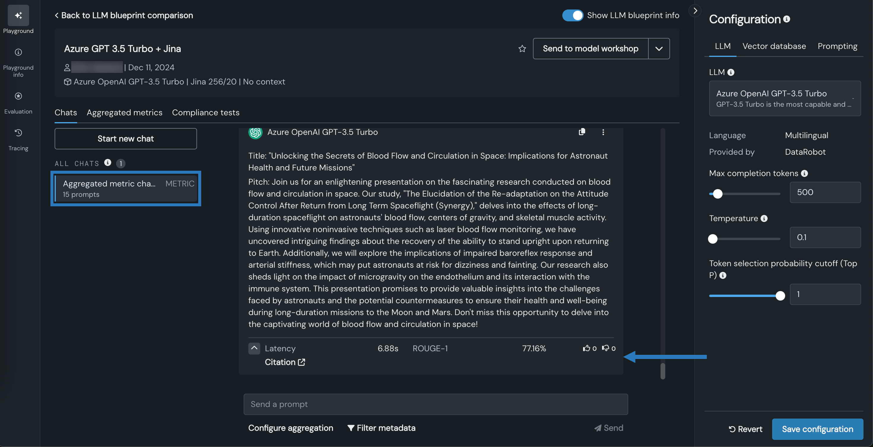 To see the row-level details that contributed to these values, click an LLM blueprint. Notice on the left panel of the Chats tab, there is an entry named Aggregated metric chat (or a different chat name, as defined in the previous section), which contains all the responses to the prompts in the evaluation dataset.