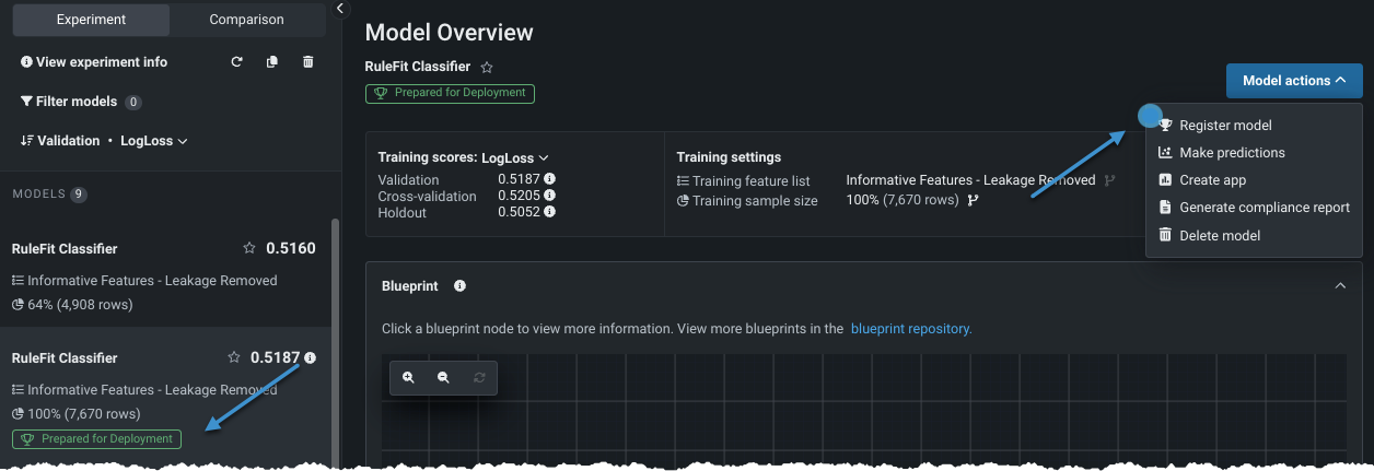 Registering models allows you to create a single source of truth for your entire AI landscape. For example, you can use model versioning to create a model management experience organized by problem type. To register a model, select it on the Leaderboard and choose Model actions > Register model. (The model that is prepared for deployment is a good choice for the walkthrough.)