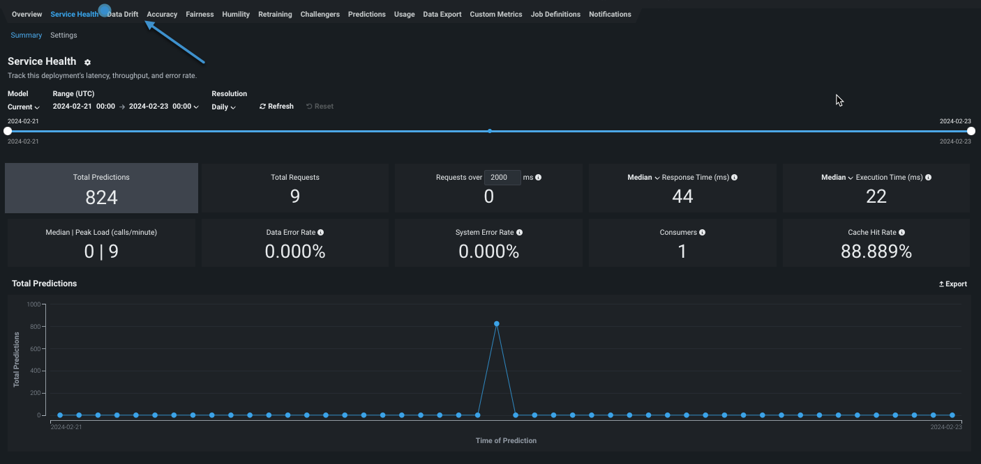 Check total predictions, total requests, response time, and other service health metrics to evaluate model operational health. Then click Data Drift to check model performance.