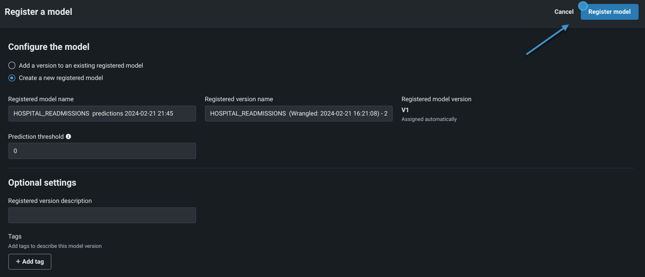 When registering a model, you specify whether to register it as a new model or a version of an existing registered model. For this walkthrough, register as a new model, optionally add a description, and click Register model.