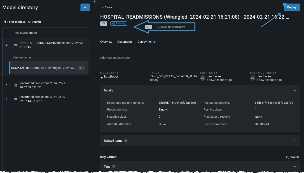 While the registration process is ongoing, you can explore the lineage and metadata that DataRobot displays. This information is crucial for traceability. Click Deploy to proceed.
