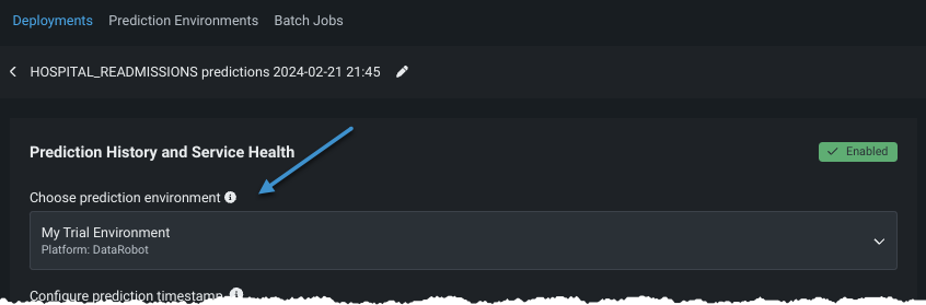 Prediction environments provide deployment governance by letting you control accessibility based on where the predictions are being made. Set an environment from this screen (an environment has been created for this trial).