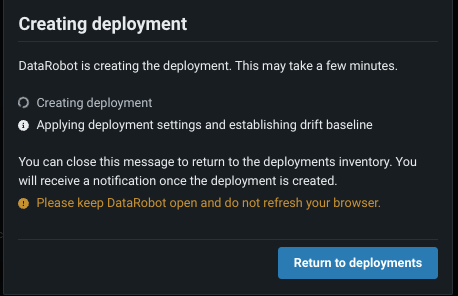 DataRobot provides a status message as it applies your settings and establishes a data drift baseline for monitoring as it creates the deployment. The baseline is the basis of the Data Drift dashboard, which helps you analyze a model’s performance after it has been deployed. Once the deployment is ready, you will automatically be forwarded to the Console overview.