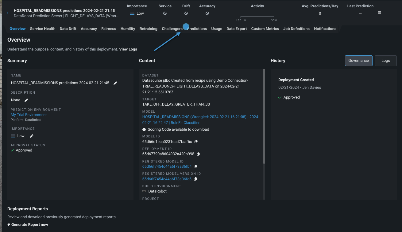 The Console overview provides a wealth of general information about the deployment. The other tabs at the top of the page configure and report on the settings that are critical to deploy, run, monitor, and optimize deployed models. Click the Predictions tab to make a one-time batch prediction.