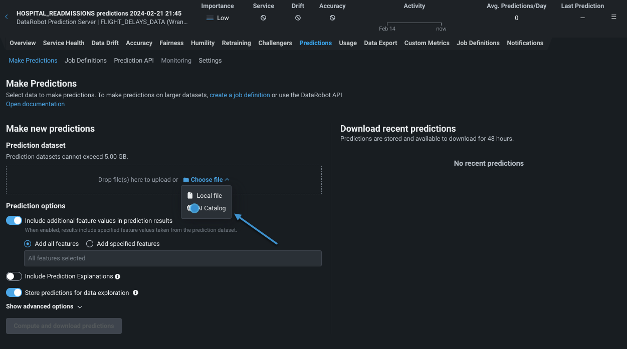 To make a batch prediction, upload a prediction dataset. If you were to upload your own scoring data, it would be automatically stored in the Data Registry. Trial users have a provided dataset that has been pre-registered. Open the Choose file dropdown and select AI Catalog as the upload origin.