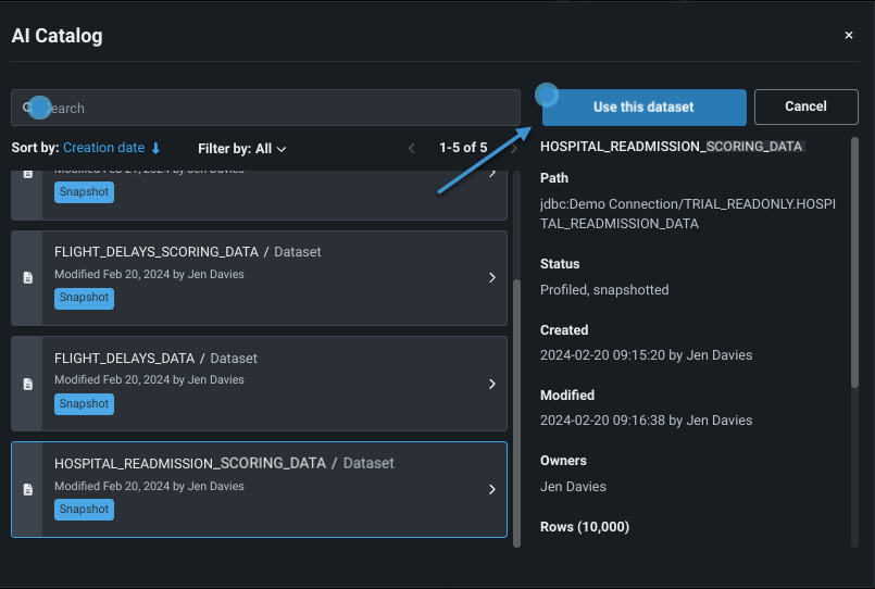 From the catalog, locate and select the prediction dataset HOSPITAL_READMISSIONS_SOCRING_DATA. Click the dataset to select it, review the dataset metadata, and when ready, click Use this dataset.