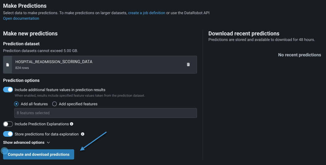 Prediction options, both basic and advanced, allow you to fine-tune model output. Explore the controls, but for this walkthrough, stick with the defaults. Scroll to the bottom of the screen and click Compute and download predictions. After computing, DataRobot lists the entry in the recent predictions section.