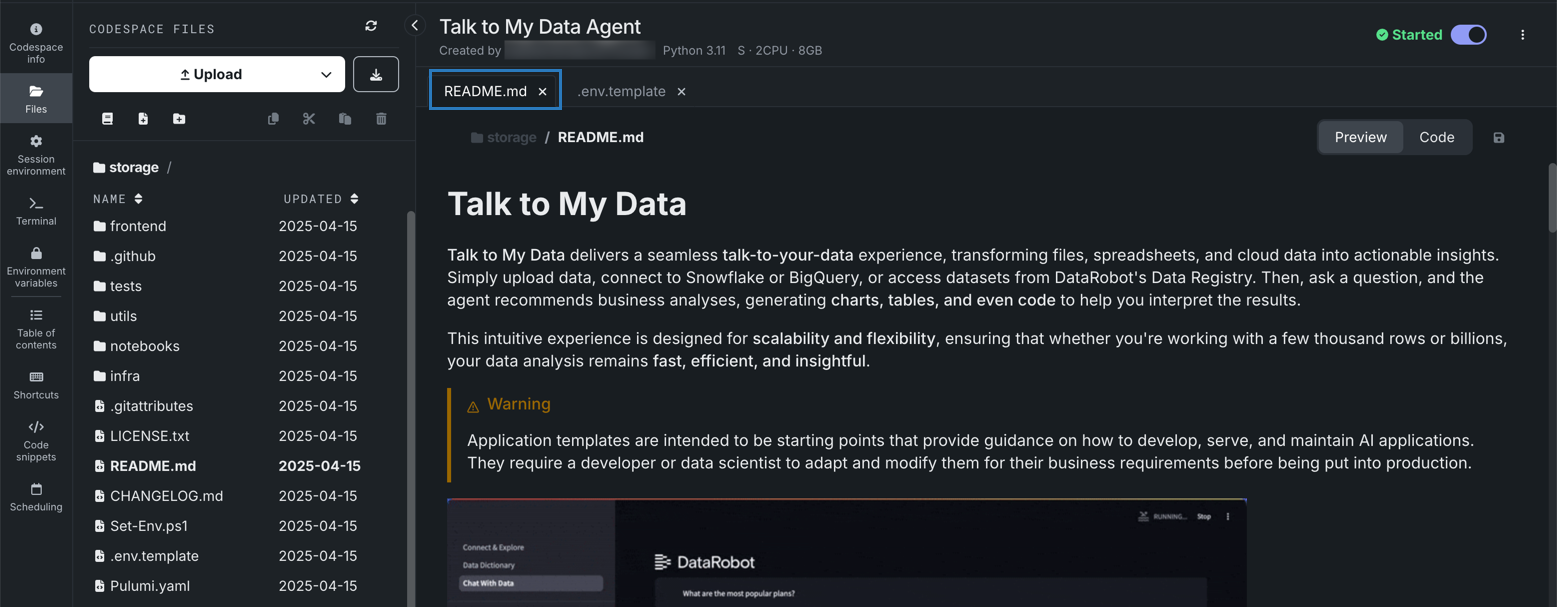 DataRobot opens and begins initializing a codespace. Once the session starts, the template files appear on the left and the README opens in the center. To learn more about the codespace interface, see Codespace sessions.