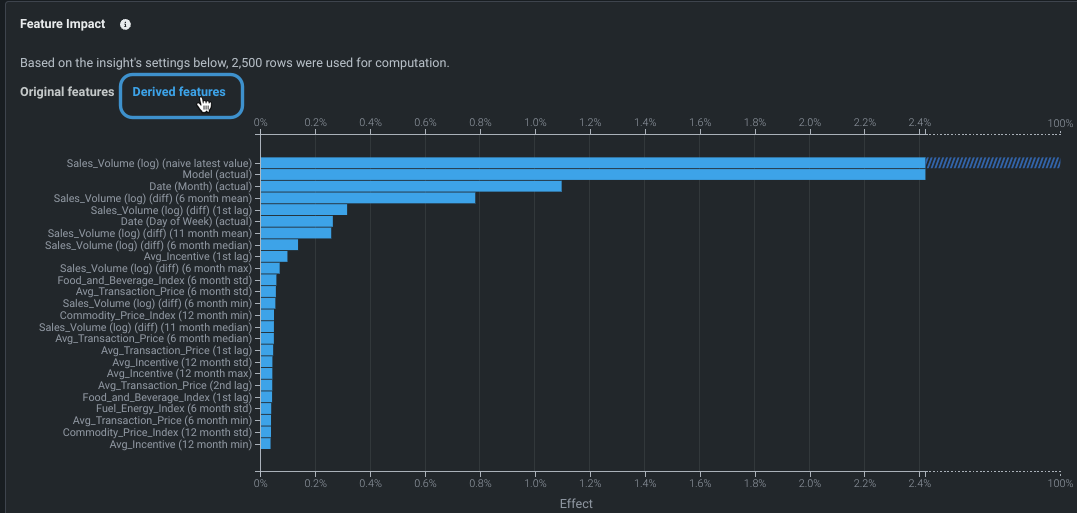 Click Feature Impact for a high-level visualization that identifies which features are most strongly driving model decisions. Click to compute the insight, if prompted. The calculation is added to the queue. When calculations complete, click the Derived features tab.