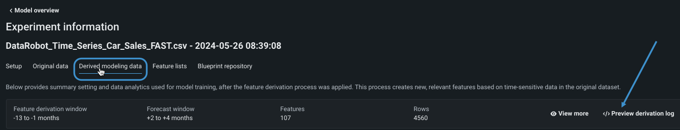 Click the Derived modeling data tab to see the data used for model training, after the feature derivation process was applied. Notice that the dataset has gone from 10 features, as shown in the Original data tab, to 107 features. You can also preview the derivation log or download the complete transformation record.