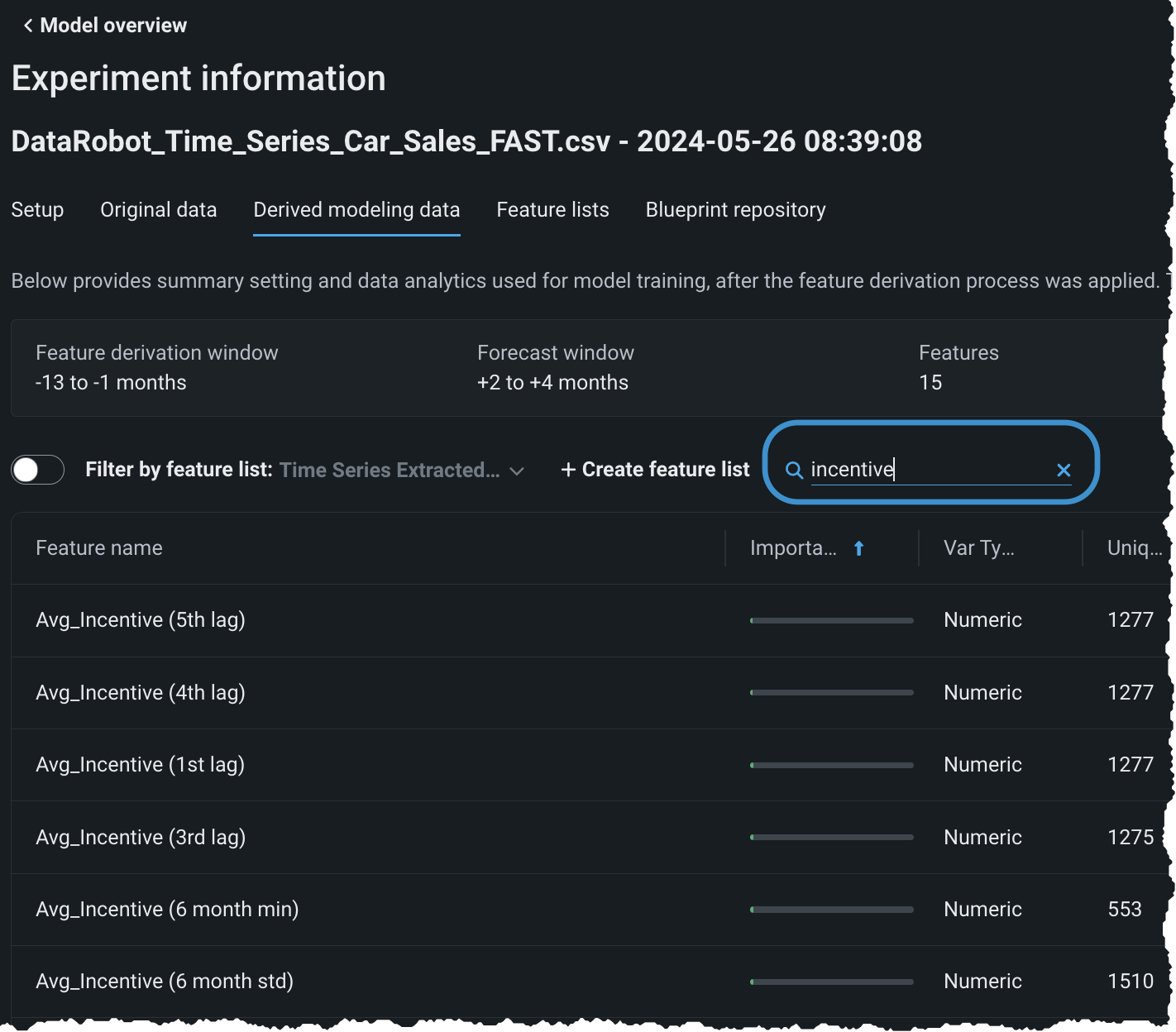 DataRobot automatically creates time series feature—lags, average/max/median, rolling, and more—based on the characteristics of the data and configured windows. For example, in the car sales dataset DataRobot has created a number of lagged (and other) features based on average incentive`: