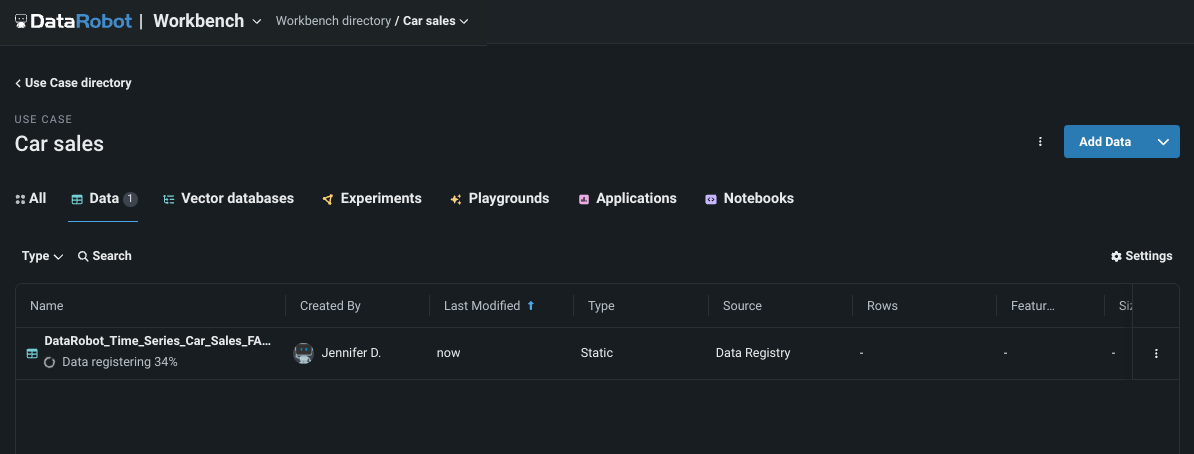 From the Workbench directory, click Create Use Case in the upper right: and name it Car sales.