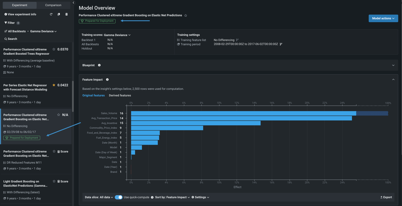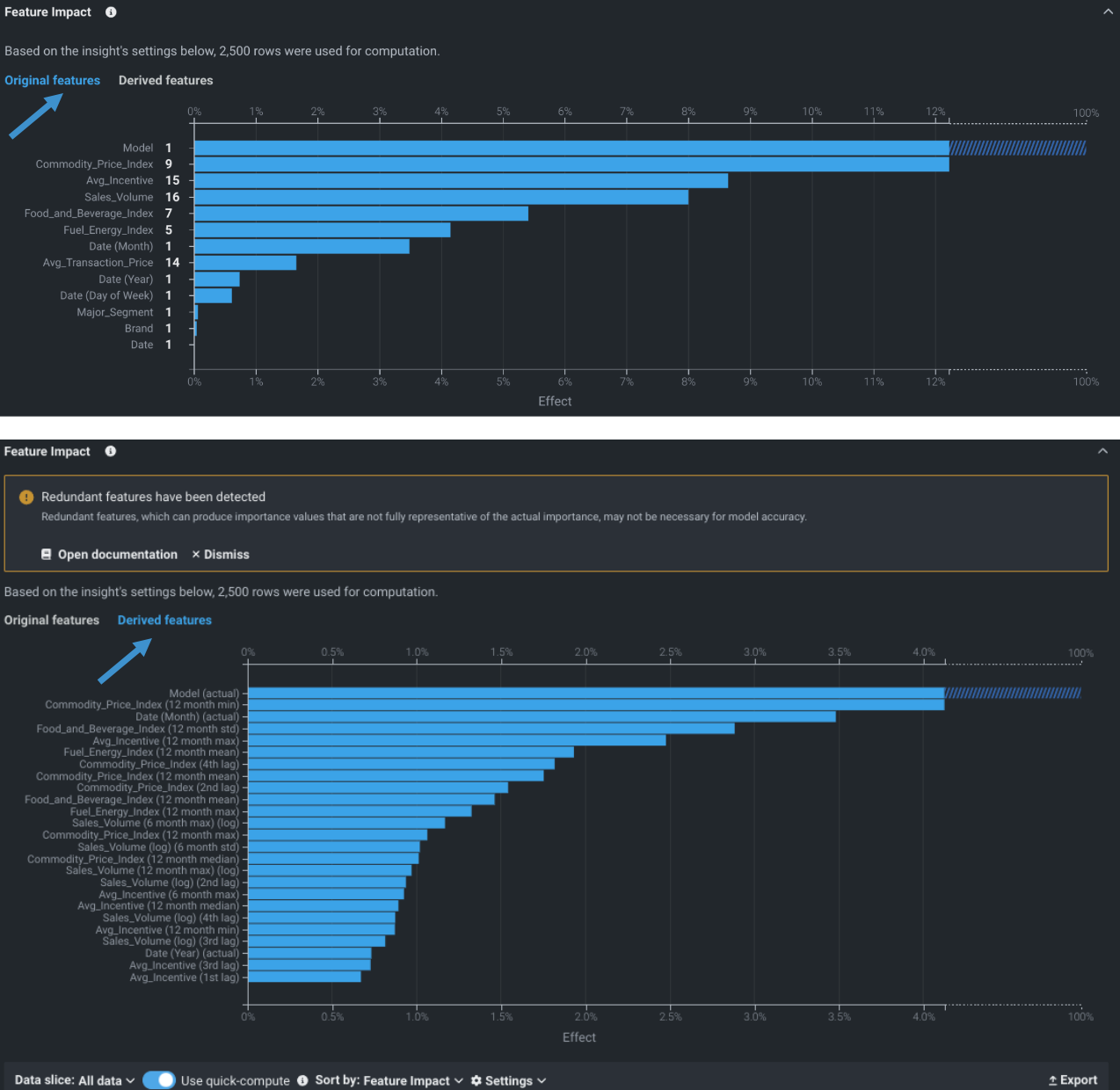 First, expand Feature Impact, which shows the relative contribution of features, both original and derived.