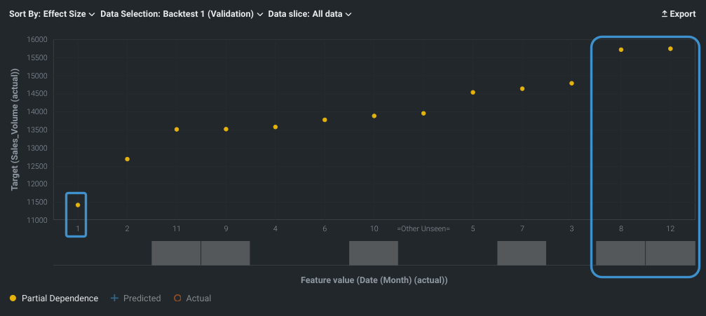 If you change the Sort by criteria to order by effect size, you can see that the fewest cars are sold in January, while the most are sold in August and December.