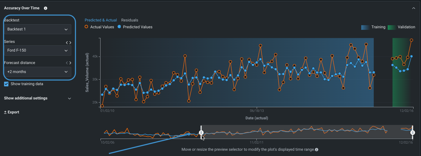 Next, scroll down to Accuracy Over Time. Predicted values are shown in blue and actual values in orange for the training (shaded blue) and validation (shaded green) periods. Use the controls to select change the series displayed, backtest or forecast distance. Use the preview selector at the bottom of the insight to zoom in on a specific time period.