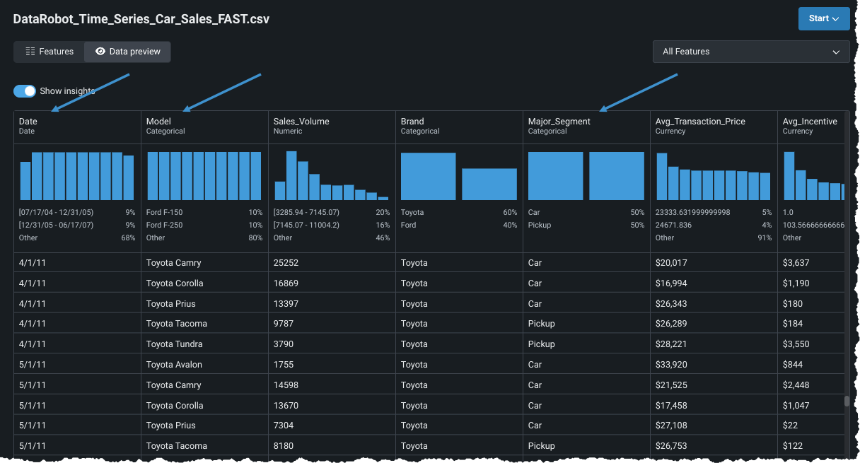 This walkthrough showcases a car sales forecasting example to learn about DataRobot time series. The dataset includes month-by-month sales for many makes and models of vehicles. On this page you will create an experiment and build models in the UI. Complete the second part of this walkthrough using a code-first approach with the DataRobot Python client. In part 2, you create the same type of experiment but use Python loops to accomplish more modeling work, faster. Watch the full video of this use case on YouTube.
