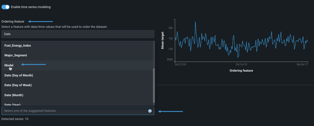 Date. In your experiments you may have to set this manually if there is more than one. DataRobot has also correctly detected the series identifier, which you confirm from the dropdown list. Alternatively you can choose another identifier. -