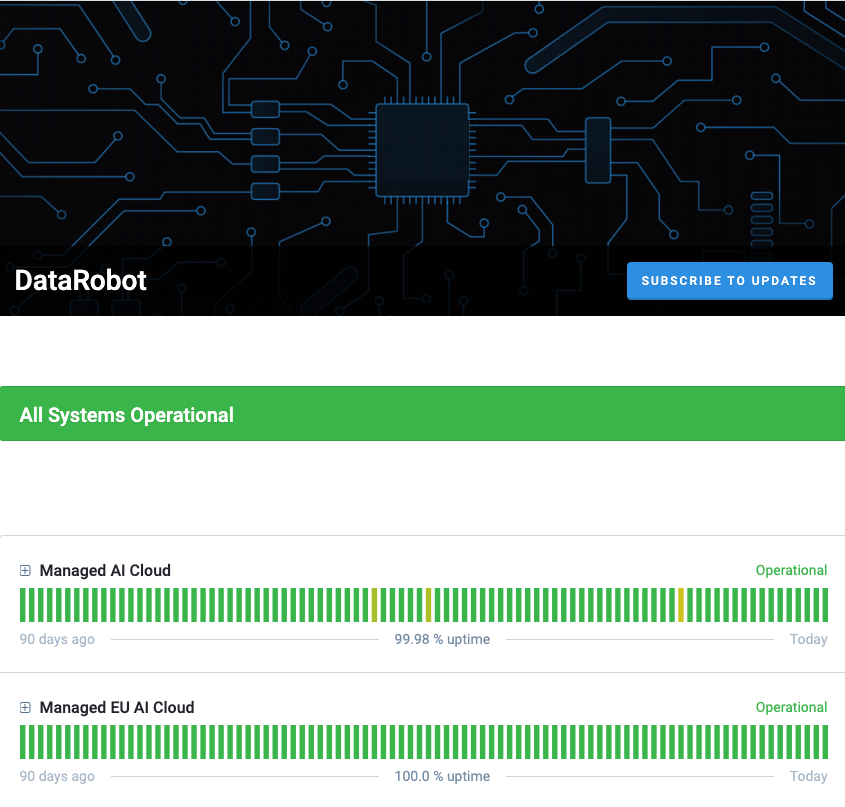 DataRobot performs service maintenance regularly. Although most maintenance will occur unnoticed, some may cause a temporary impact. Status page announcements provide information on service outages, scheduled maintenance, and historical uptime. You can view and subscribe to notifications from the DataRobot status page.