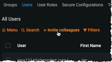 On the Users tab of the resulting page, click Invite colleagues and provide an email address in the modal:
