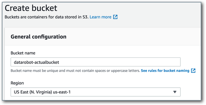 Actual CSV prediction results are written to a monitored area of an AWS S3 bucket. If one does not exist, create the new area to receive the results. Files are expected to be copied into this bucket from external sources such as servers, programs, or databases. To create a bucket, navigate to the S3 service within the AWS console and click Create bucket. Provide a name (like datarobot-actualbucket) and region for the bucket, then click Create bucket. Change the defaults if required for organizational policies.