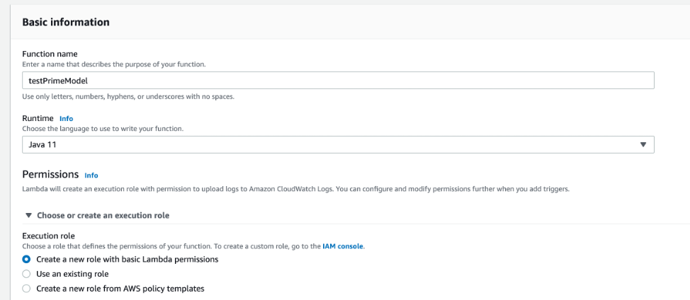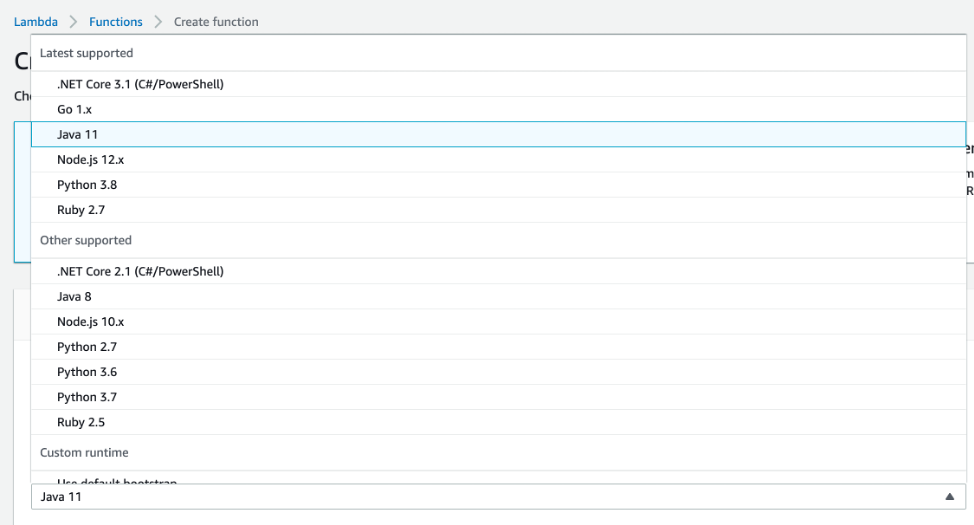 Choose Java 11 to create the Lambda function.