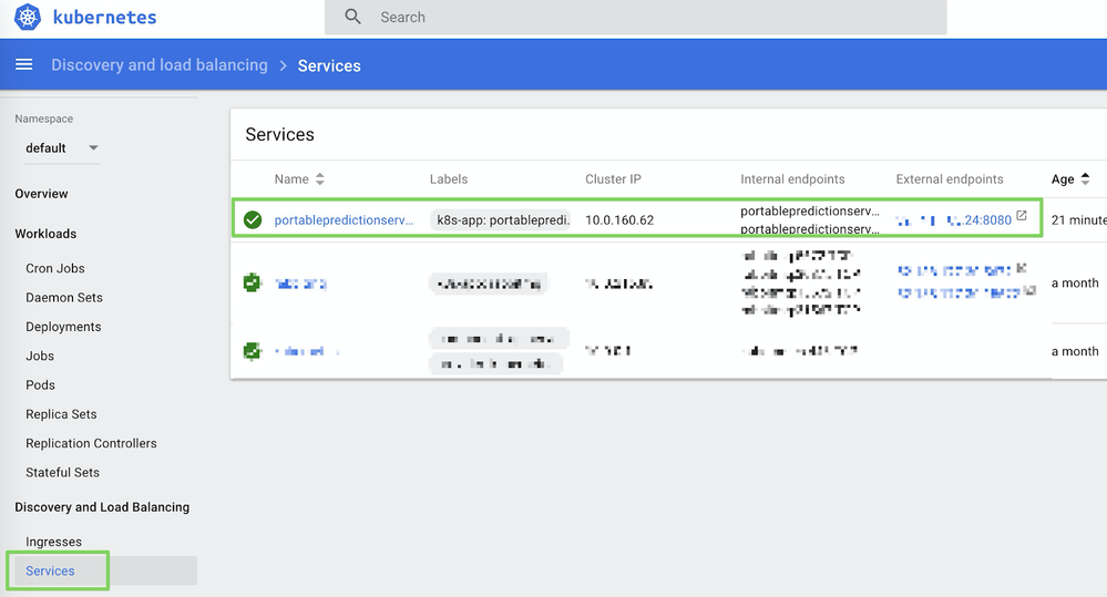 To test the model, download the DataRobot PPS Examples a Postman Collection, and update the hostname from localhost to the external IP address assigned to your service. You can find the IP address in the Services tab on your Kubernetes dashboard: