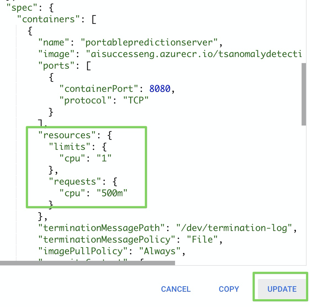 Alternatively, you can update the deployment directly in the Kubernetes dashboard by editing the JSON as shown below and clicking UPDATE.