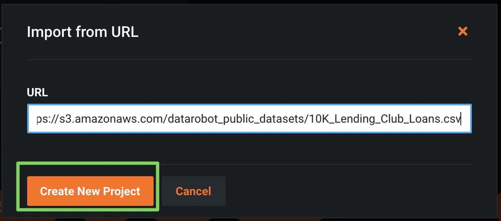 In the Import URL dialog box, paste the LendingClub dataset URL and click Import from URL: