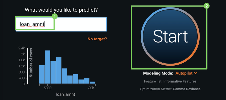 loan_amtas your target (what you want to predict)(1) and click Start (2) to run Autopilot.