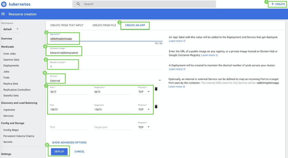 Field Value 3 App name e.g., rabbitmqdemo4 Container image e.g., rabbitmq:latest5 Number of pods e.g., 16 Service External7 Port and Target port 5672and5672