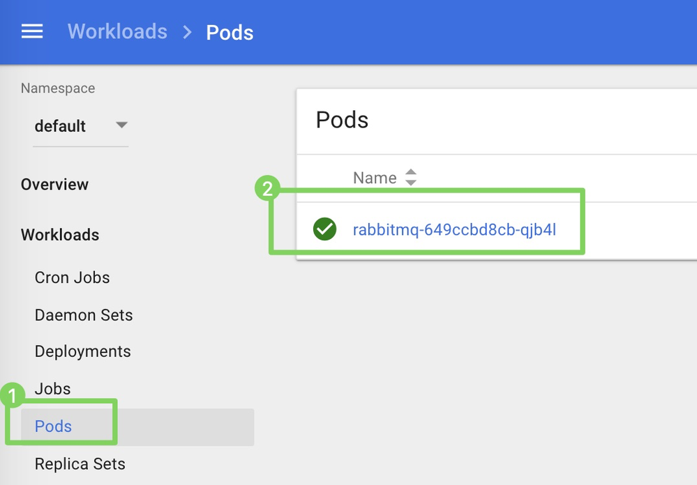 Click Pods (1) and click the container Name (2) to connect to the CLI of the container.