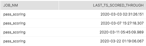 The next job scores any changed records greater than or equal to the last run, but before the current job run timestamp. Upon successful completion of the job, a new record will be placed into this table.