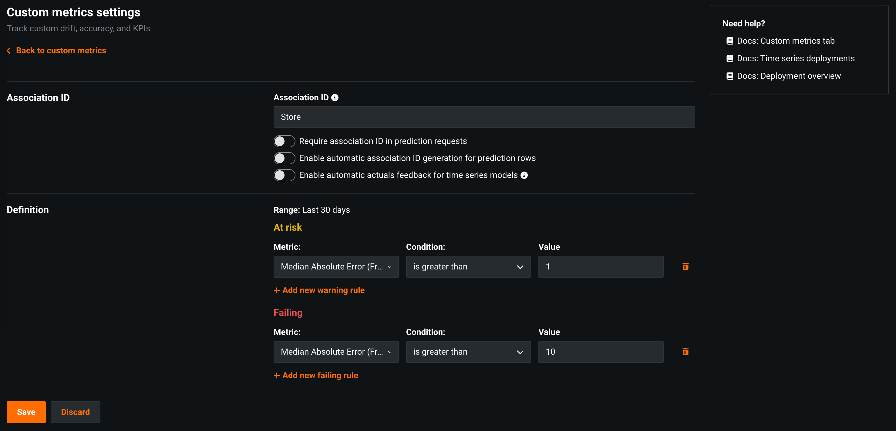 Configure thresholds to alert you when a deployed model is "at risk" or "failing" to meet the standards you set for the selected custom metric.