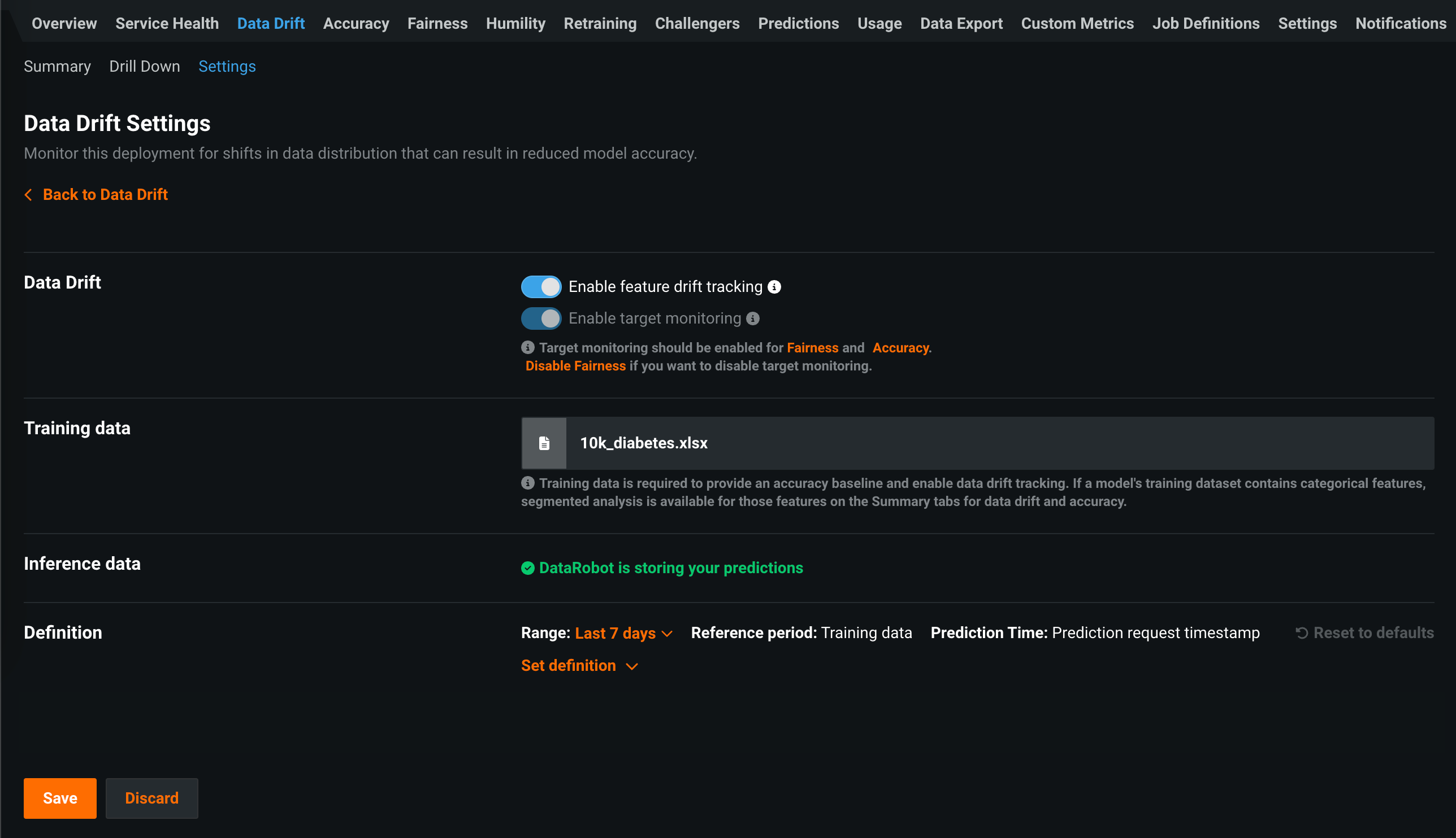 On a deployment's Data Drift Settings page, you can configure the following settings: