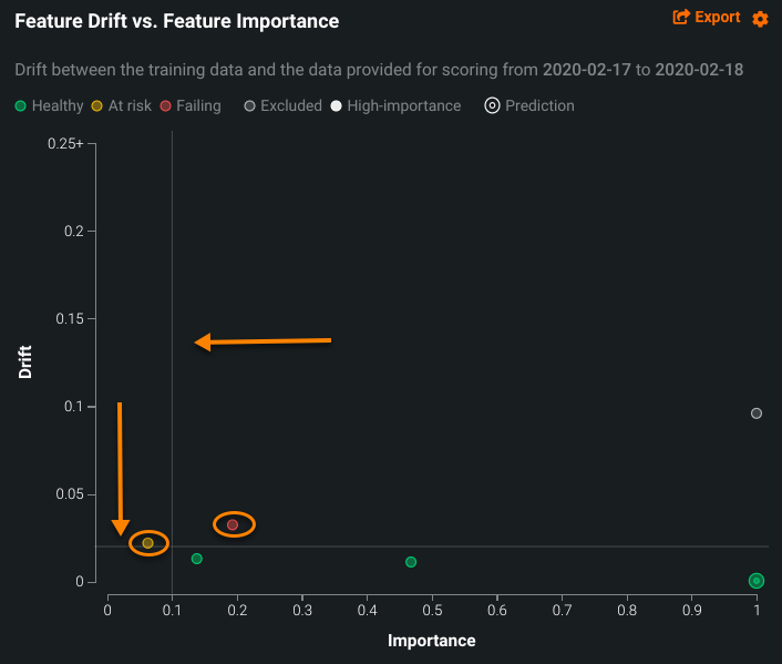 In the example below, the starred feature, which appears as a white circle, would normally cause drift status to be "At Risk" due to its initially low importance. However, since it is assigned high importance, the feature will change the drift status to "Failing" (