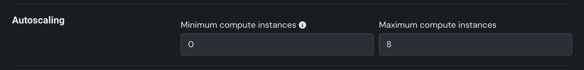 | Maximum compute instances | Set the maximum compute instances for the model deployment to a value above the current configured minimum. To limit compute resource usage, set the maximum value equal to the minimum. The minimum and maximum compute instances depend on the model type. For more information, see the compute instance configurations note. |