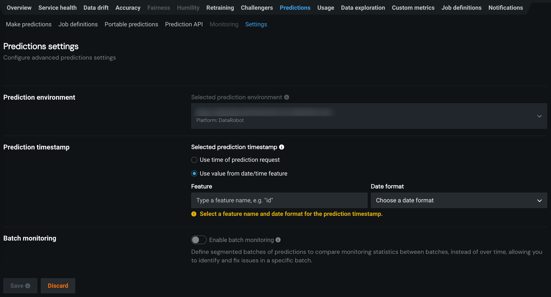 On a deployment's Predictions > Settings tab, you can view details about your deployment's inference (also known as scoring) data—the data containing prediction requests and results from the model.