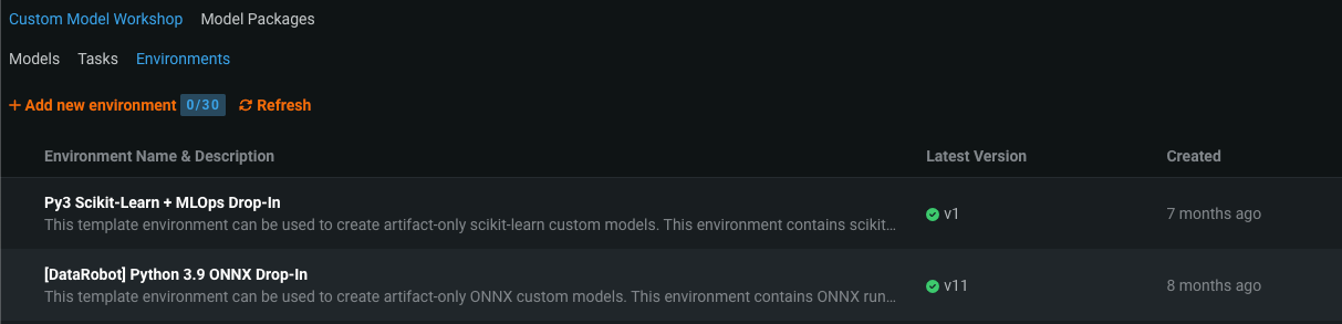 DataRobot provides drop-in environments in the Custom Model Workshop. Drop-in environments contain the model requirements and the start_server.sh file for a custom model so that you don't need to provide them in the model's folder. The following table details the drop-in environments provided by DataRobot. Each environment is prefaced with [DataRobot] in the Environments tab of the Custom Model Workshop. You can select these drop-in environments when you create a custom model.