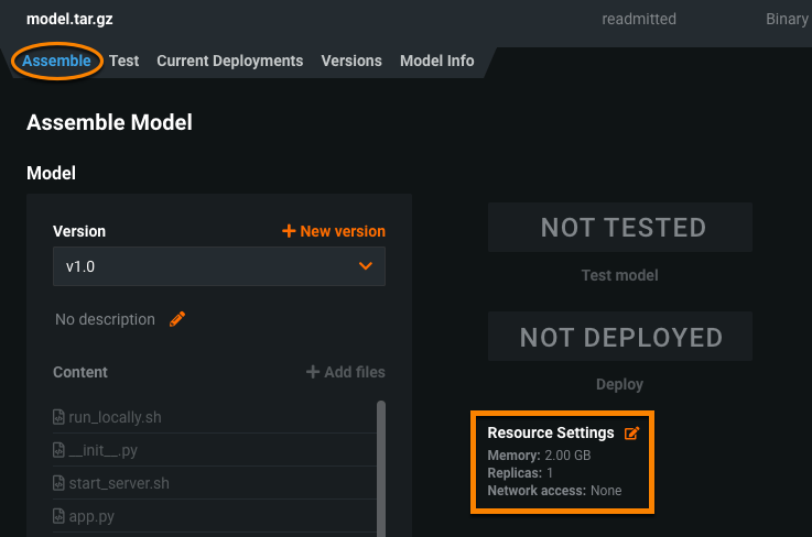 On the custom model's Assemble Model page, under the deployment status, configure the Resource Settings: