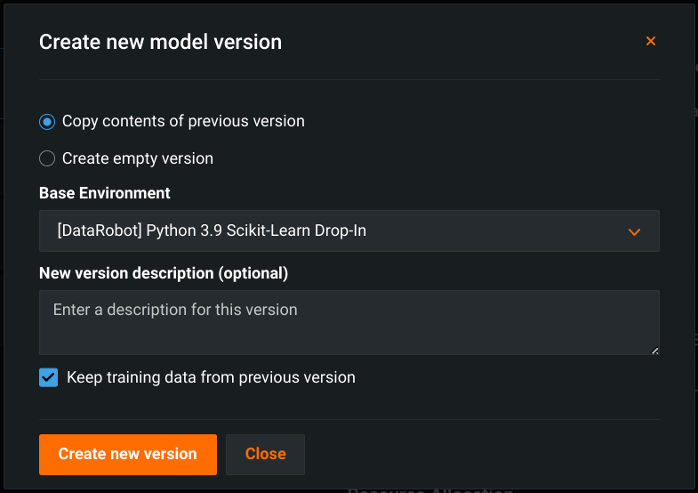 Setting Description Copy contents of previous version Add the contents of the current version to the new version of the custom model. Create empty version Discard the contents of the current version and add new files for the new version of the custom model. Base Environment Select the base execution environment of the new version. The execution environment of the current custom model version is selected by default. In addition, if the selected execution environment does not change, the version of that execution environment persists from the previous custom model version, even if a newer environment version is available. For more information on how to ensure the custom model version uses the latest version of the execution environment, see Trigger base execution environment update. New version description Enter a description of the new version. The version description is optional. Keep training data from previous version Enable or disable adding the training data from the current version to the new custom model version. This setting is enabled by default. -